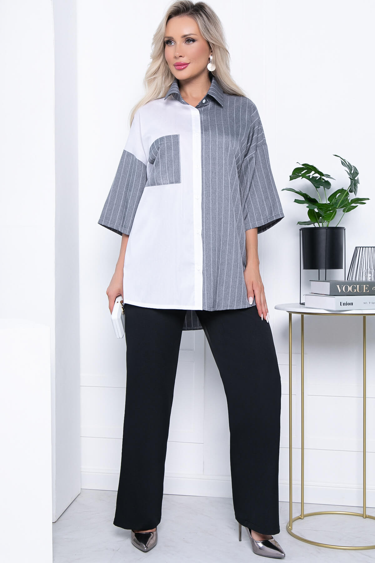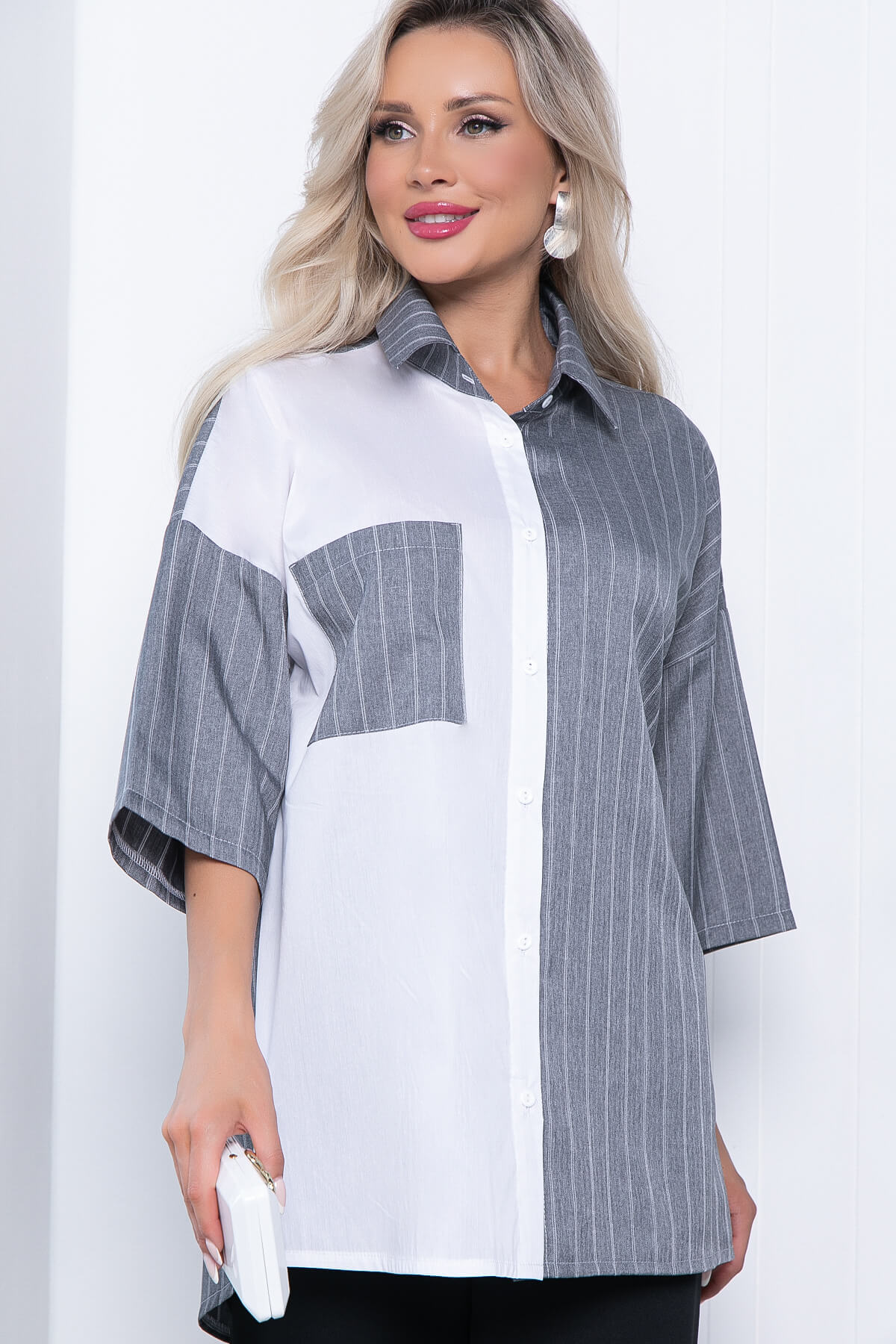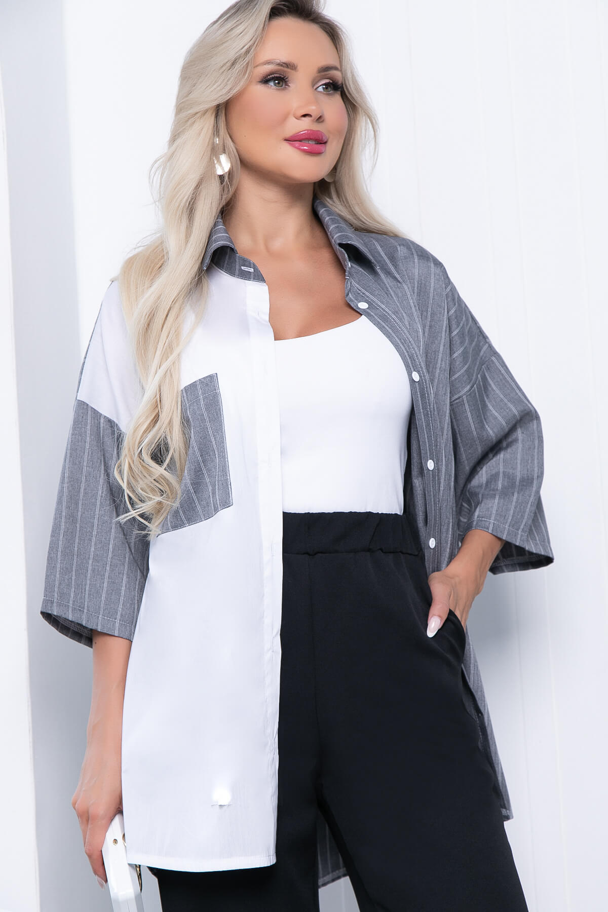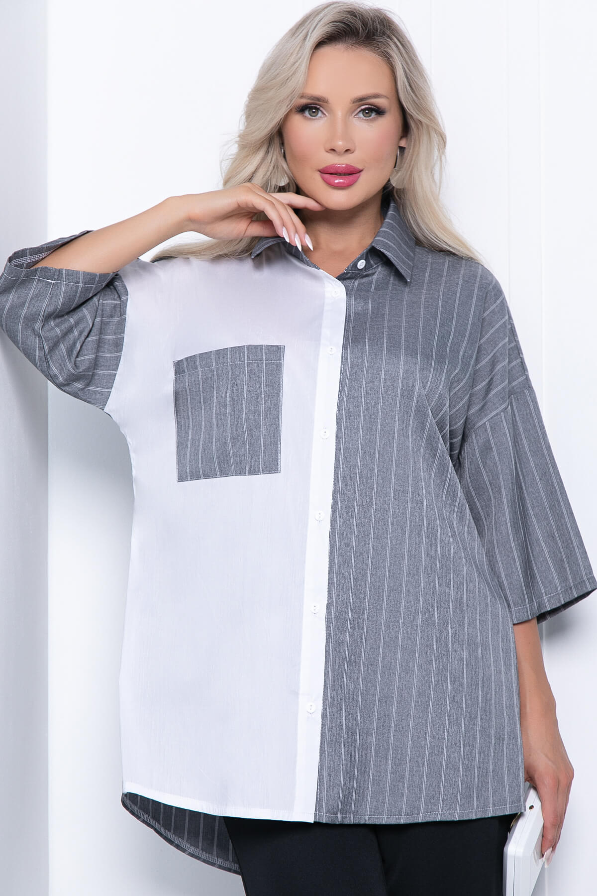 Функциональное и лаконичное изделие обладает привлекательным дизайном и оригинальным оформлением, большим потенциалом и корректирующими способностями. Изделие универсально и будет отлично сочетаться с любым элементом Вашего гардероба. Рубашка будет отлично смотреться с брюками или джинсами! Ее так же можно использовать верхним слоем с топом. По спинке удлинена. Рукав со спущенным плечевым швом, три четверти.