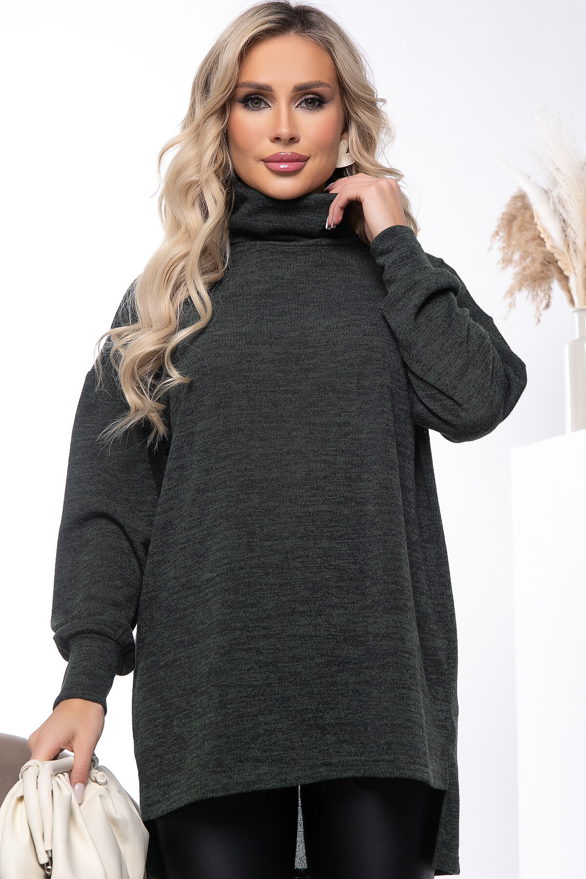 Горловина оформлена воротником "Хомут". По бокам джемпера есть разрезы.