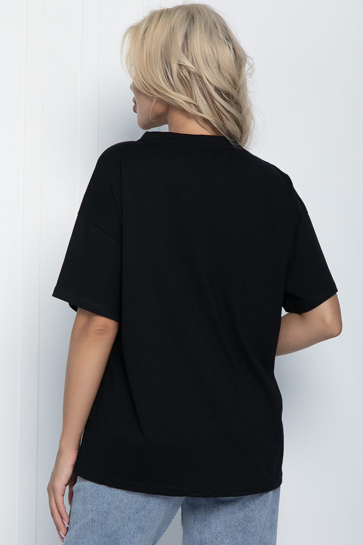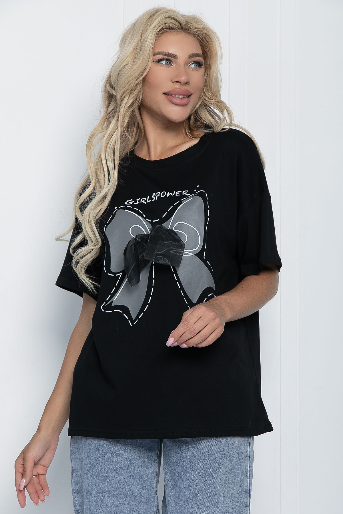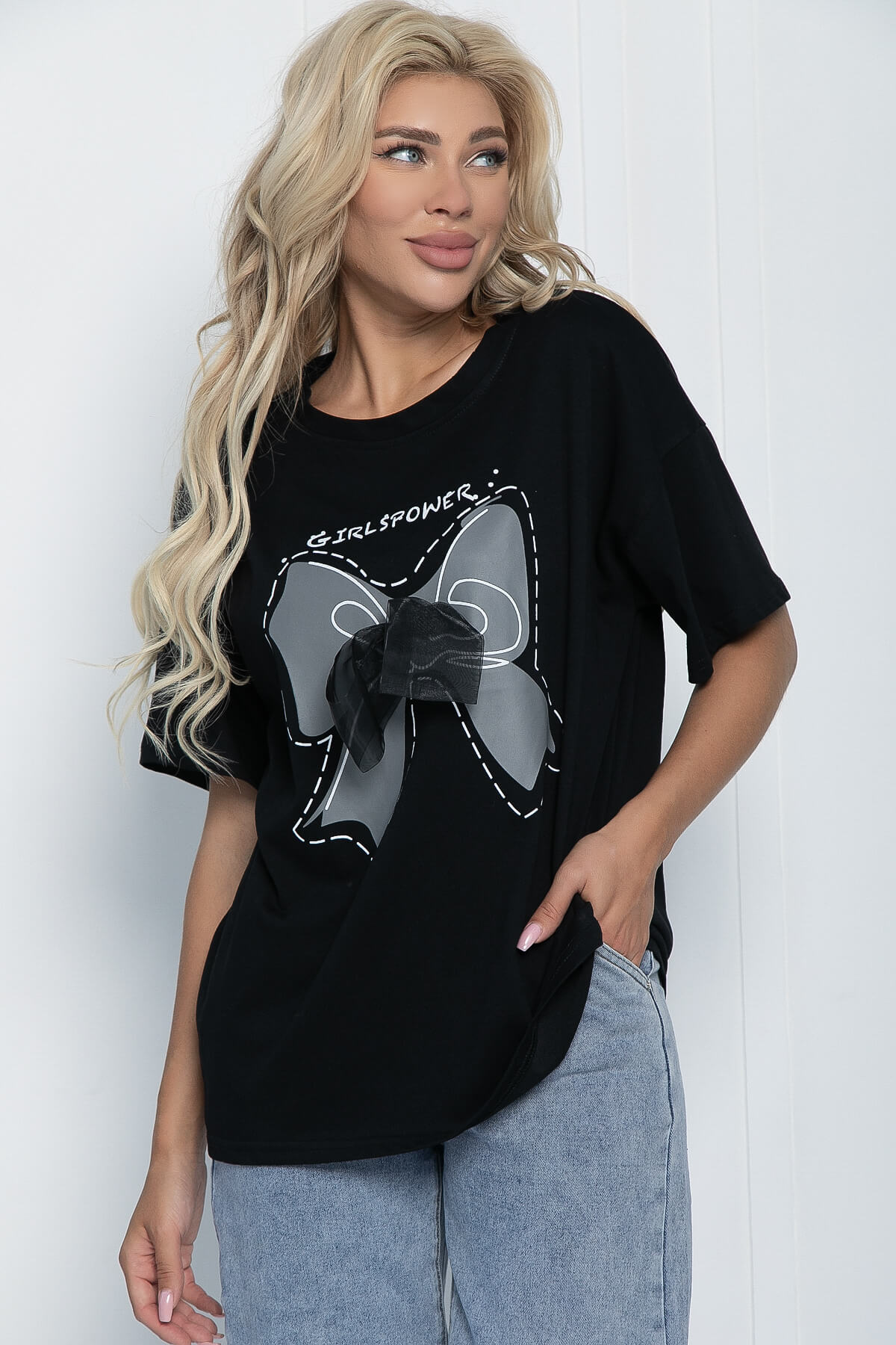 Чёрная футболка прямого кроя с декоративной печатью и милым бантиком станет отличным дополнением вашего базового гардероба. Она не только украсит ваш образ, но и придаст ему особый шарм. Такая футболка подойдёт как для праздничного, так и для повседневного образа.