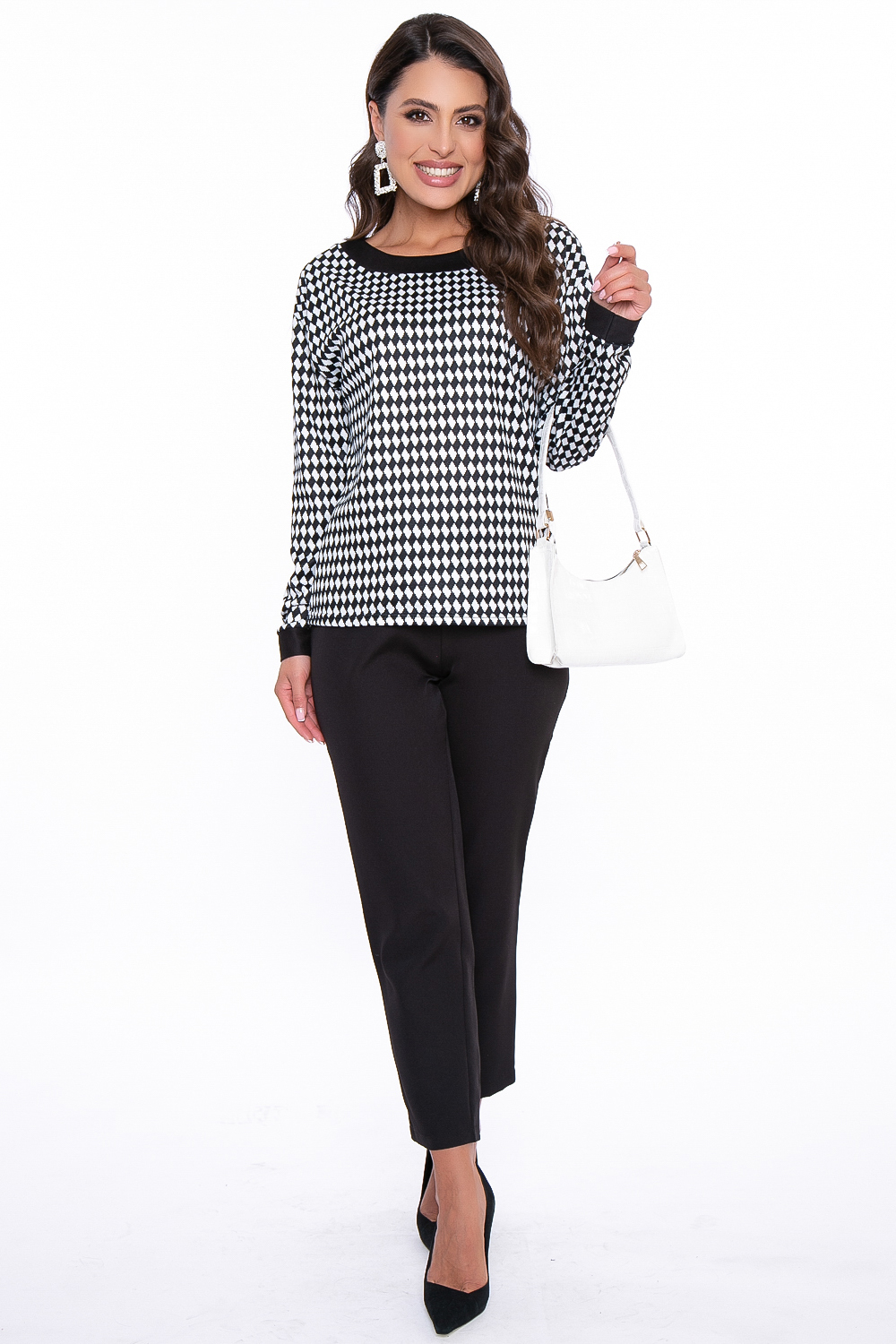 - Однотонные чёрные обтачки по горловине и по низу рукава;