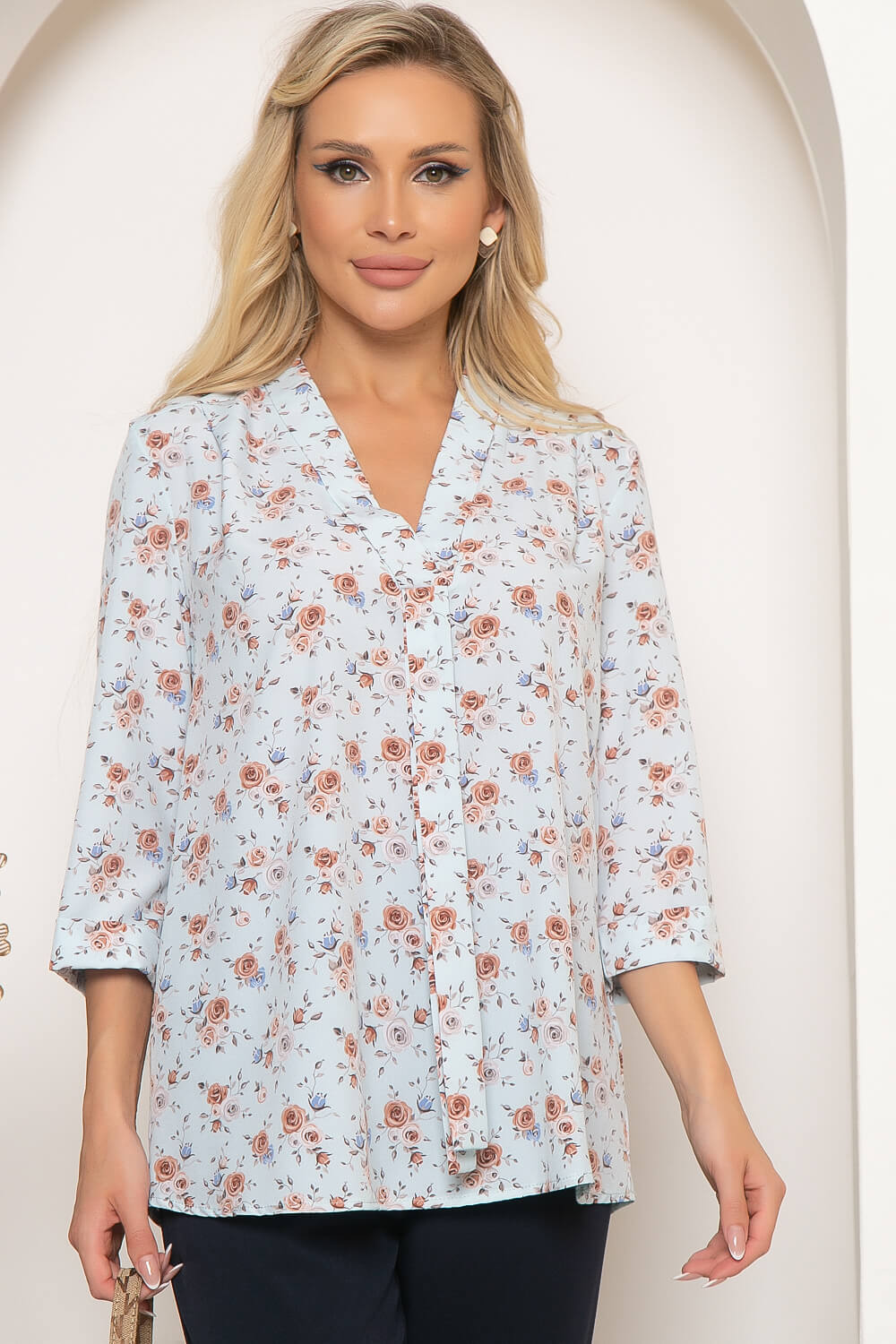 Блуза прямого силуэта, выполнена из очень приятной к телу ткани, в нежно-голубом оттенке с цветочным принтом. Рукав втачной, 3/4, низ рукава с отворотом. По спинке отрезная кокетка, заложена декоративная складка. Воротник отложной, мягко переходит в галстук, который можно завязать на бант.