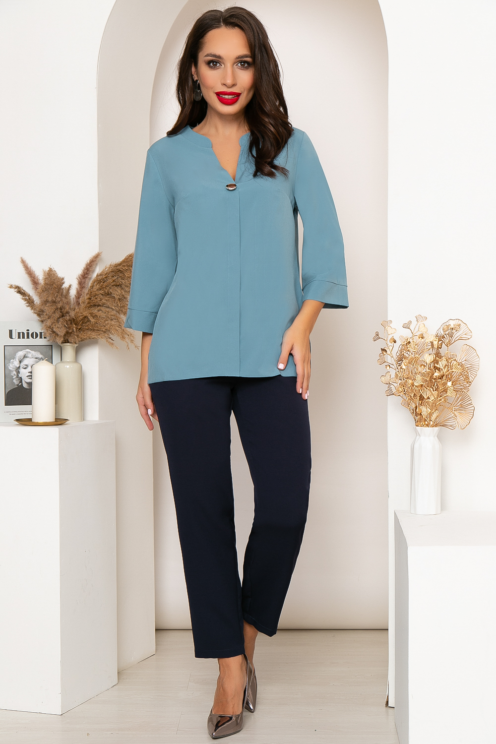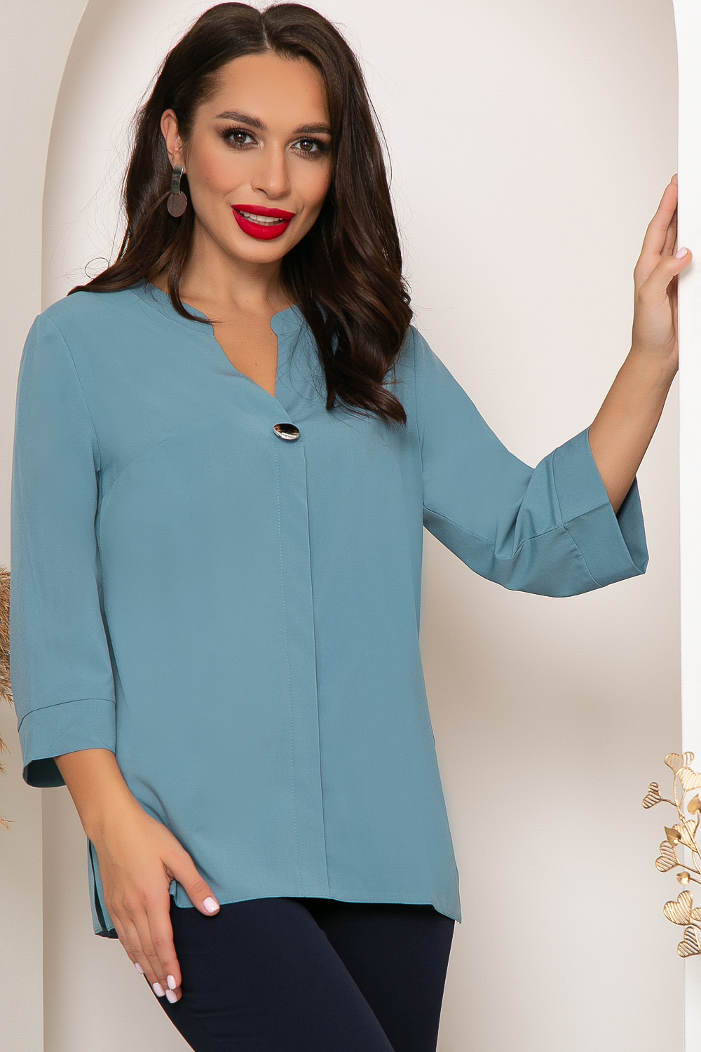 Классическая блуза для создания элегантных деловых образов. Изящный V-образный вырез горловины украшен серебристой пуговицей. Рукав втачной, три четверти, на широкой манжете. По бокам блузы разрезы.