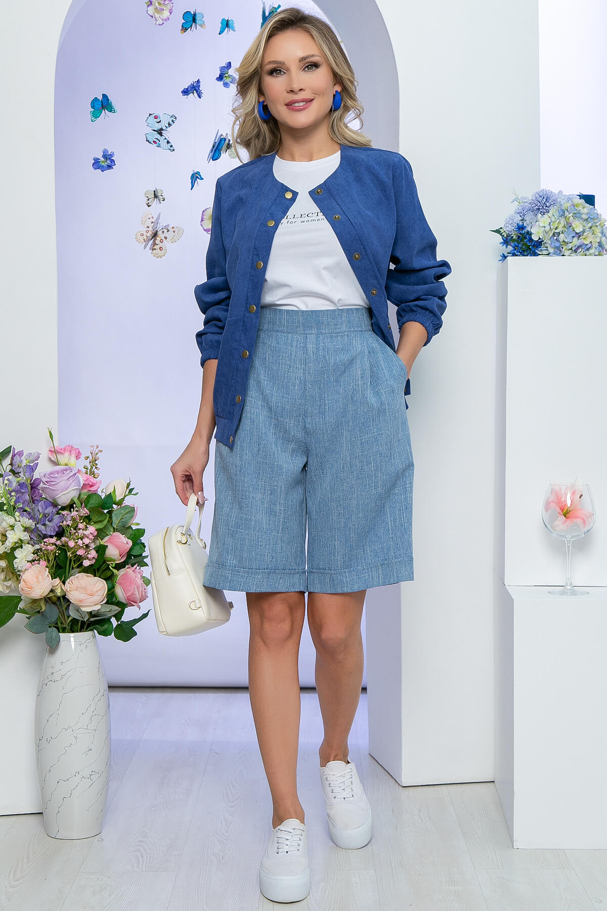 При создании образа модели использовался Бомбер "Диамант" (джинс) Б5526 и Футболка "LT Collection" Б3735