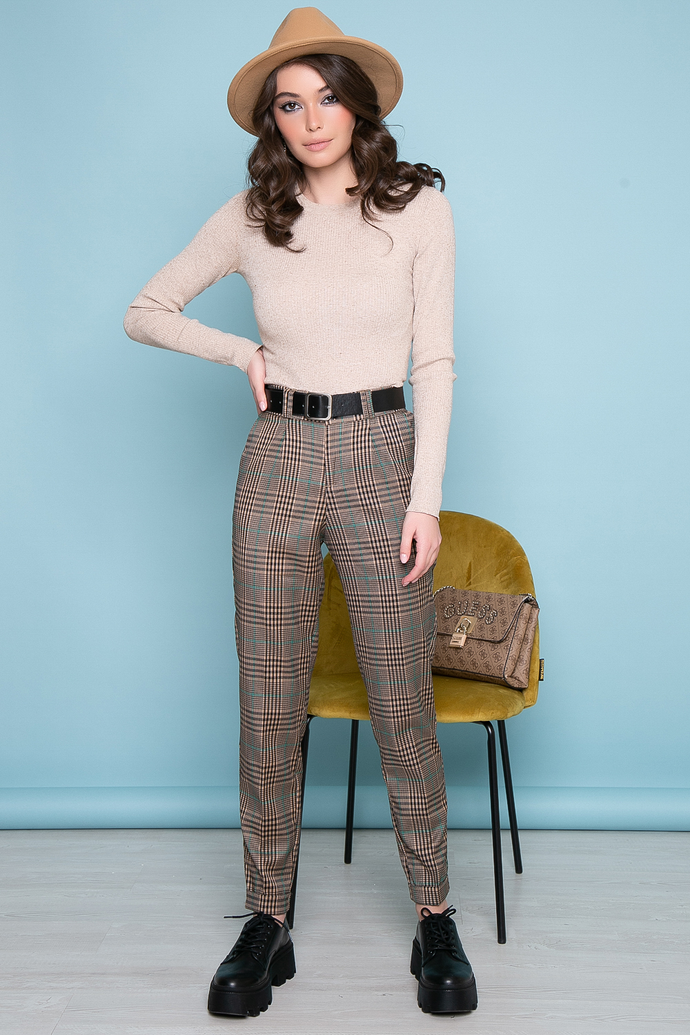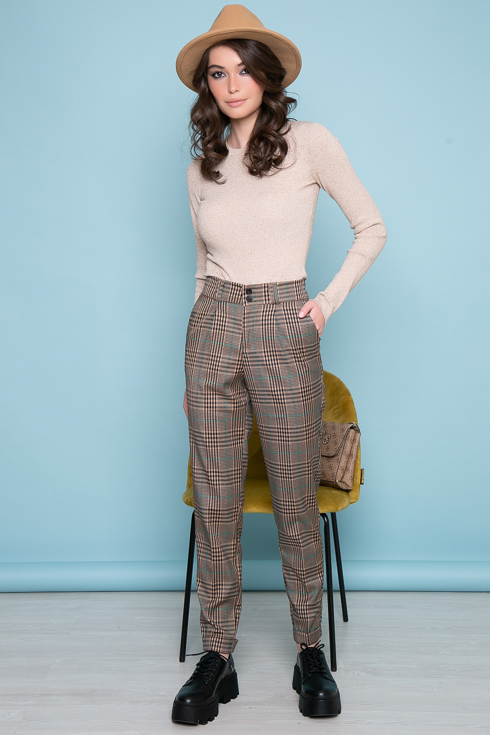 Брюки с классическим принтом клетка - беспроигрышный вариант на каждый день. Идеально сочетаются с блузами, джемперами и жакетами базовых оттенков. Притачной пояс брюк на резинке,что обеспечивает идеальную посадку. В боковых швах есть карманы. Низ брюк подвернут, что создает еще более интересный и современный образ. В комплекте пояс.