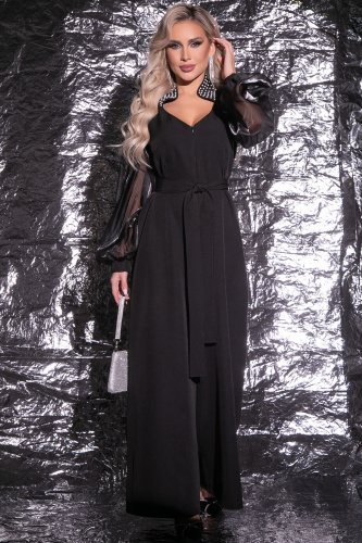 Комбинезон из лёгкой ткани идеально подойдёт для вечернего расслабленного образа. Свободный крой не сковывает движений и дарит комфорт. Рукав длинный, выполнен из шифона, что придает воздушности. Акцента образу придает вырез, который идеально подчеркивает зону декольте. В таком комбинезоне вы точно будете блистать на праздничном вечере!