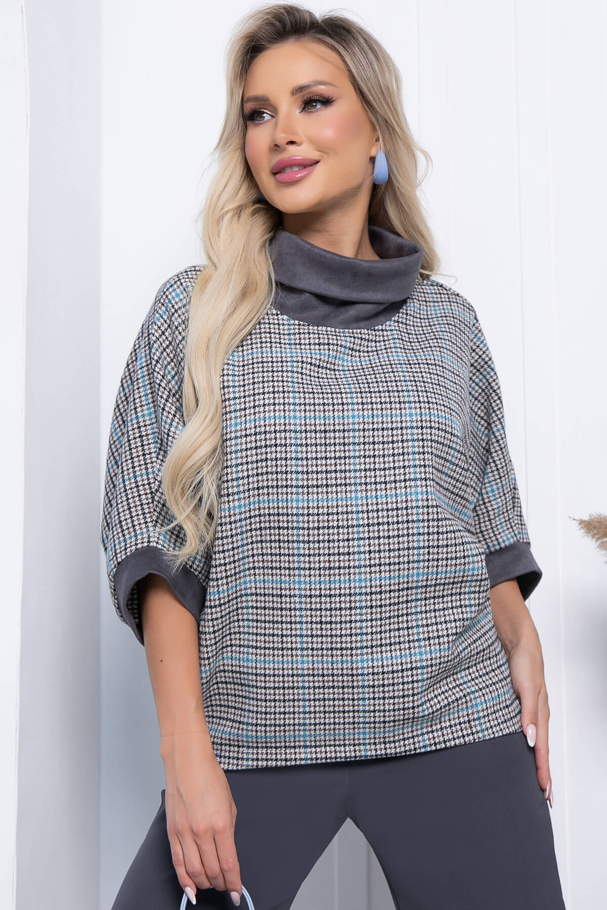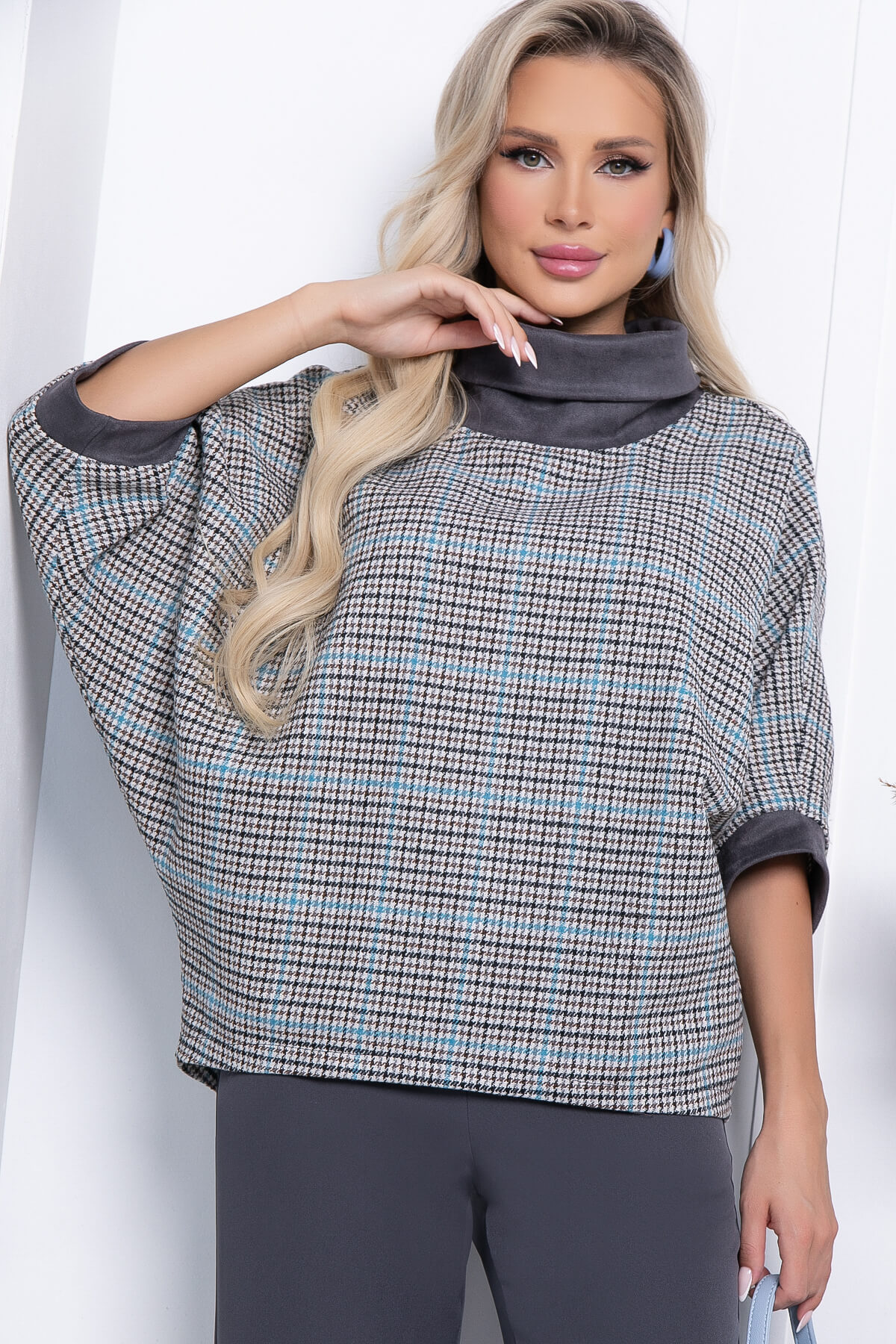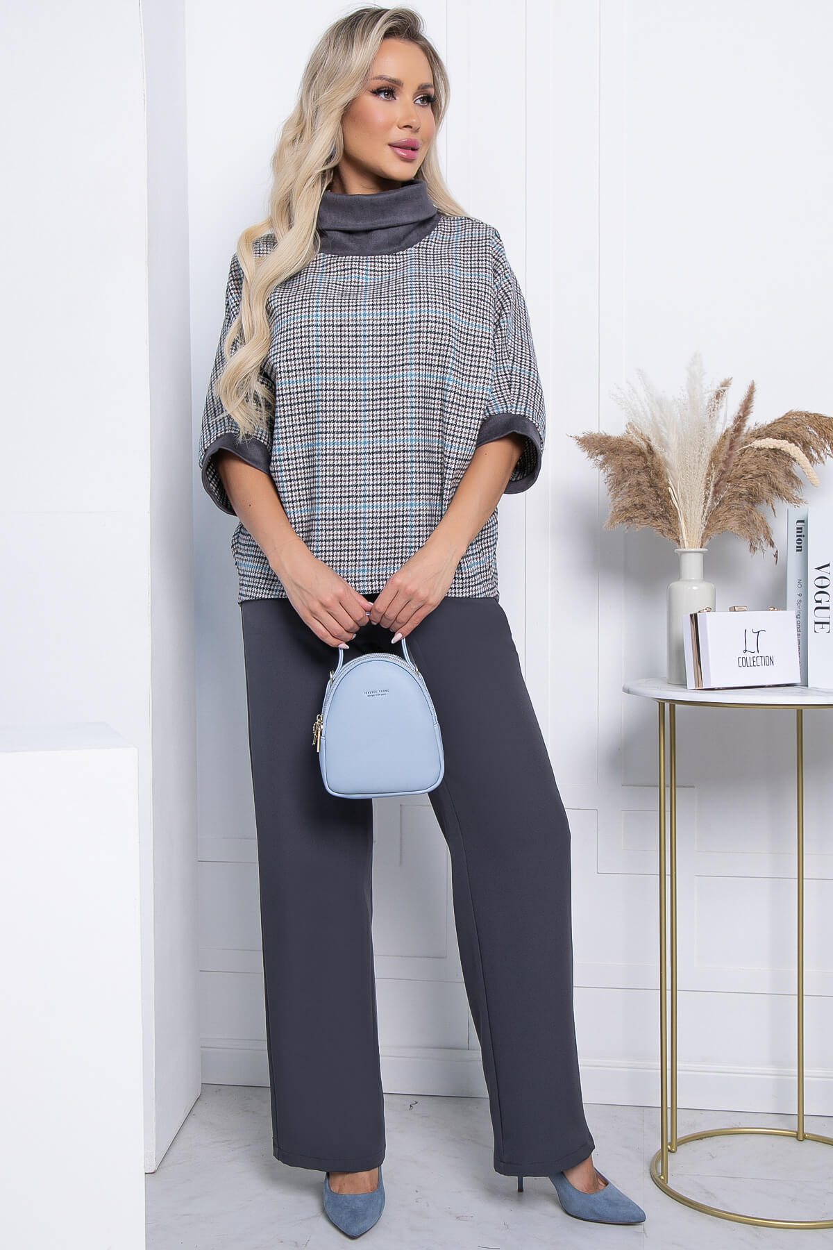 Костюм-двойка, состоящий из классических брюк прямого кроя и джемпера свободного кроя. Преимущество комплекта в том, что Вы сможете самостоятельно носить как джемпер, так и брюки. В повседневном образе смело сочетайте с лоферами или ботинками, а если нужен более официальный образ - то с туфлями на каблуке. Костюм выполнен из плотной костюмной ткани. Акцентом данной модели является пройма рукава - "Летучая мышь".