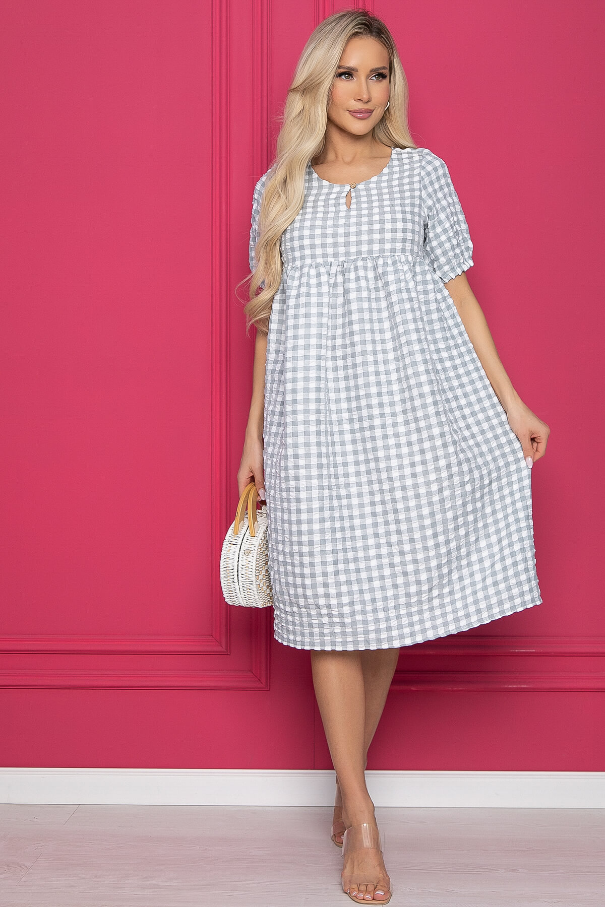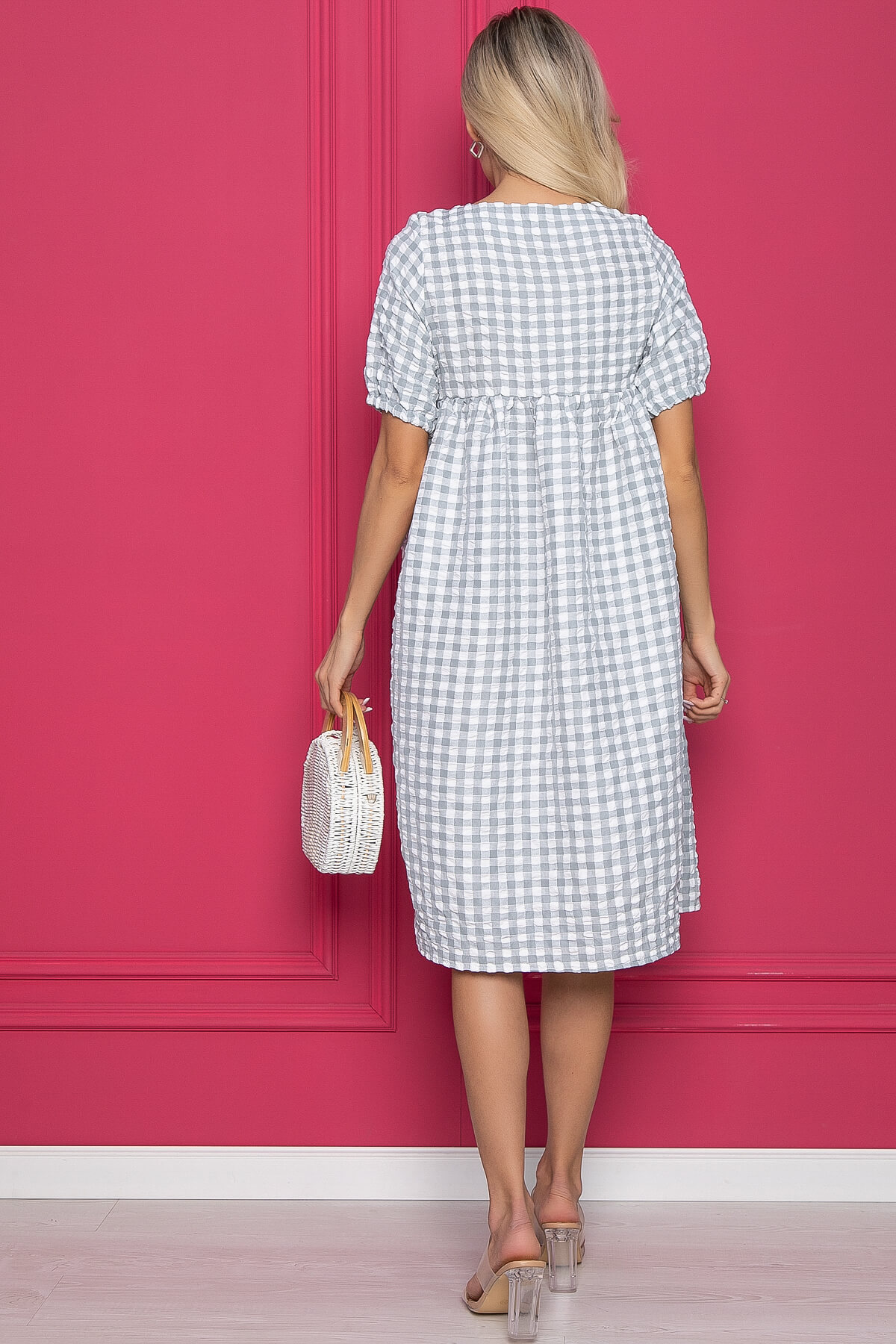 Платье с отрезной кокеткой и юбкой на сборке. Рукав короткий, пышный на резинке. По горловине спереди застежка на пуговку.