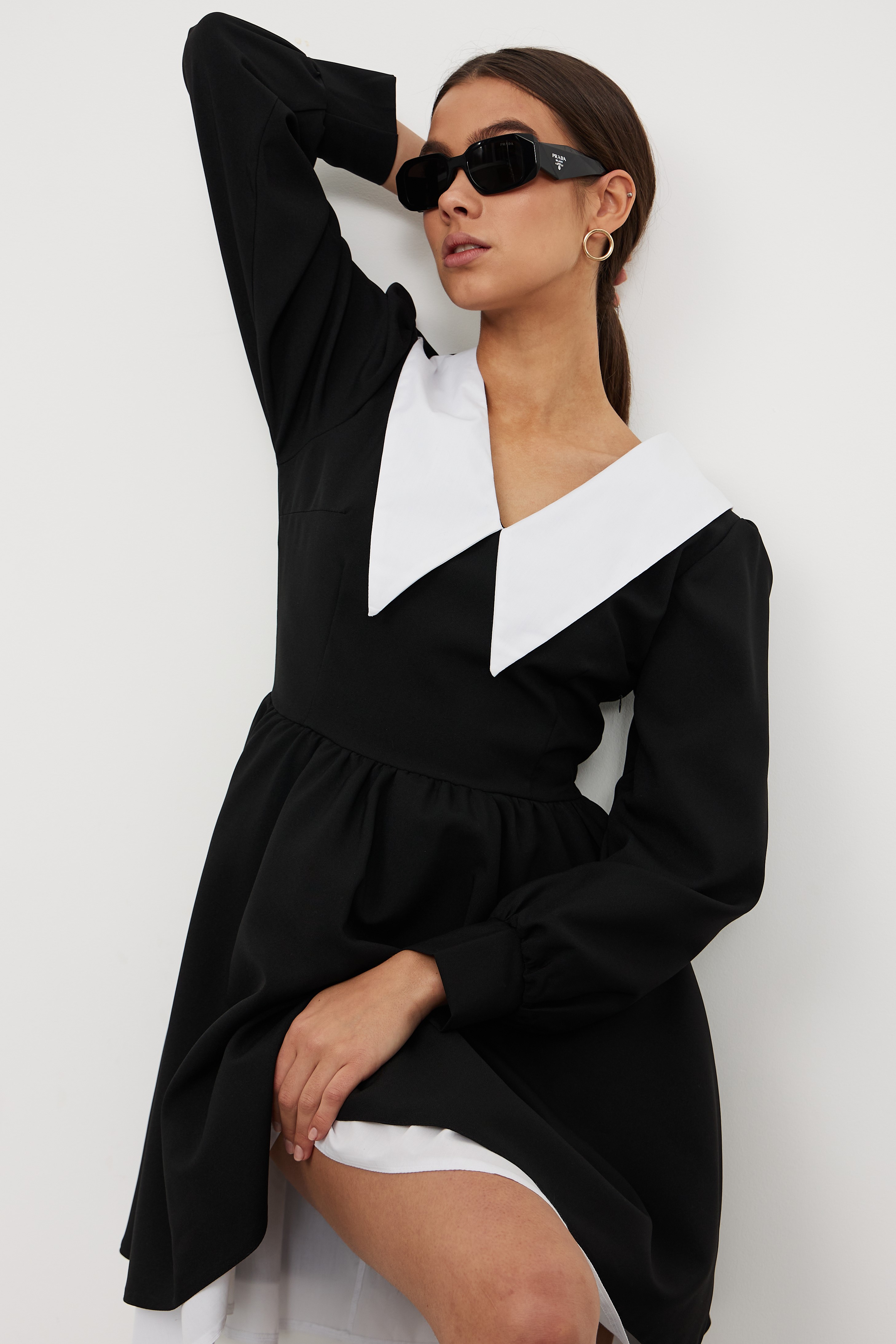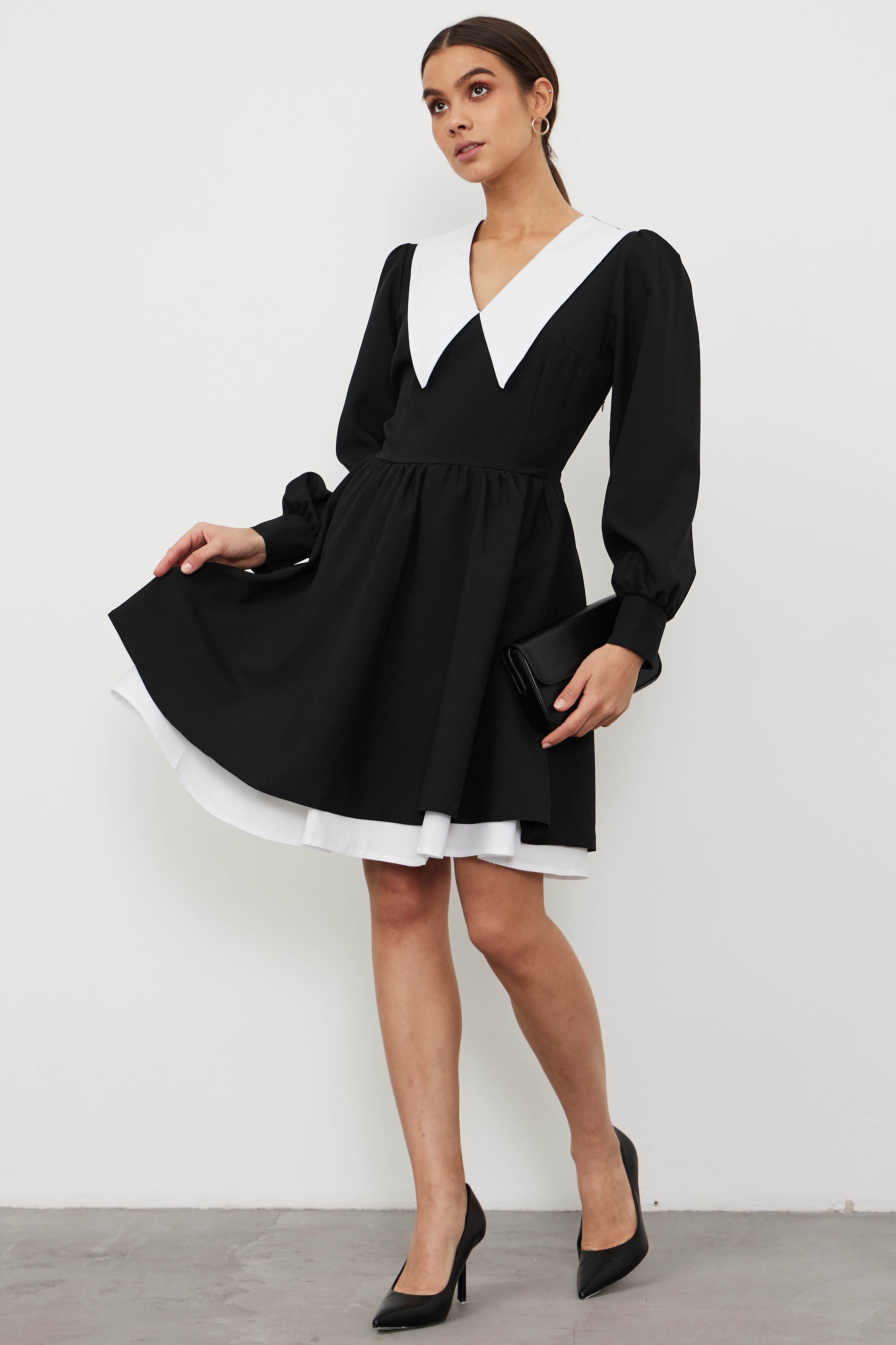 Черное платье с белым воротником и подъюбником НЕ СЪЕМНЫМ — это неотъемлемая часть вашего гардероба, которая считается классикой. Легкое воздушное платье с белым воротником с заостренными углами вытягивает визуально вашу шею, делая ее более длинной, изящной. Рукав фонарик длинный, юбка пышная свободная, декольте V-образное закрытое, молния сбоку, платье без пояса и принта, подъюбник и воротник не съемные. Данное трендовое платье считается школьное, повседневное, офисное, коктейльное, классическое, базовое. Для более высоких женщин платье будет длинной мини (короткое), но в разумных пределах (модель на фото 175 см). Для девушек маленького роста (невысоких) (менее 160) платье будет до колен. Платье подойдет каждой девочке-подростку, молодежи, школьницы. Покрой и ткань очень приятные к телу, что есть неотъемлемой частью выбора. Сочетание нашего платья с красивой обувью и аксессуарами автоматически подойдет для любого праздника: выпускной, свадьба, выписка и многие другие торжества. Но также можно его надевать и в школу на последний звонок или 1 сентября, и на работу, и просто на прогулку с подружкой или с детьми.
