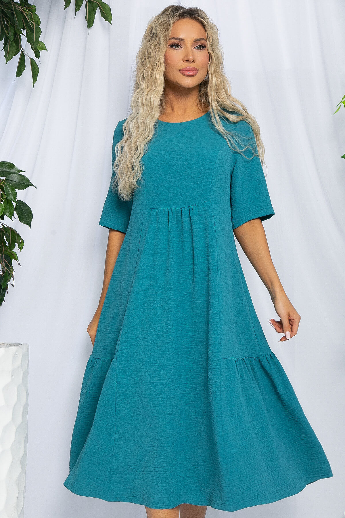 Платье свободного кроя средней длины — это прекрасный выбор для создания стильного и комфортного летнего образа! Его округлая горловина и втачные рукава средней длины придают платью изысканность. Платье расширяется к низу от линии груди, создавая нежный и воздушный силуэт. Декоративные элементы в виде сборок по бокам и чуть ниже линии груди спереди и сзади придают ему неповторимую изюминку. Это платье станет настоящим украшением вашего гардероба!