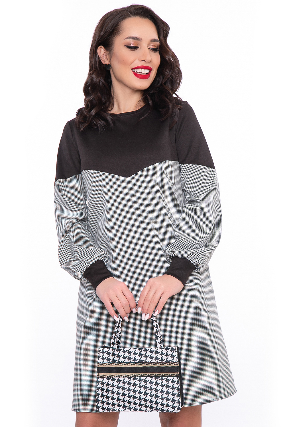Платье в клетку с контрастным верхом А-силуэта. Рукав втачной, длинный, на манжете. Мягкий округлый вырез горловины. Верхняя часть платья выполнена из чёрной, контрастной ткани, что, безусловно, добавляет платью в клетку оригинальность!