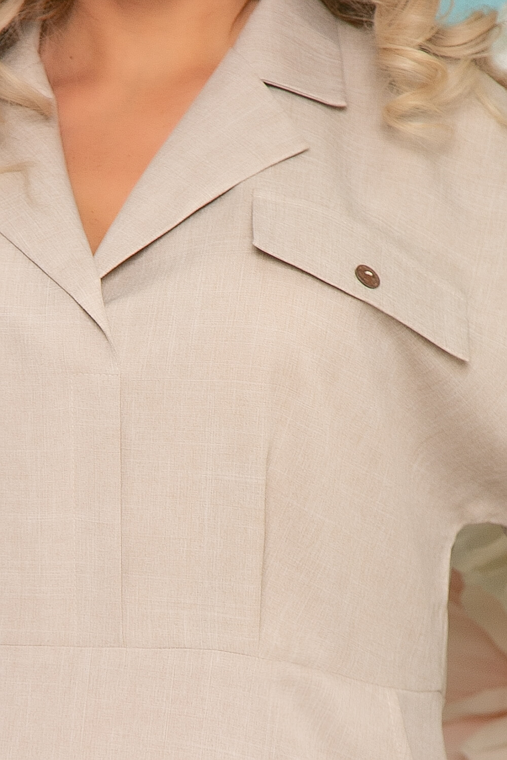 Дизайнерское платье средней длины в базовом бежевом оттенке, которое подойдёт, как для работы в офисе, так и для праздничного мероприятия. Платье прямого кроя, отрезное по линии талии с защипами по переду. Верхняя часть платья, безусловно, является акцентной: отложной воротник, цельнокроенный рукав, клапаны с пуговками создают неповторимый образ.
