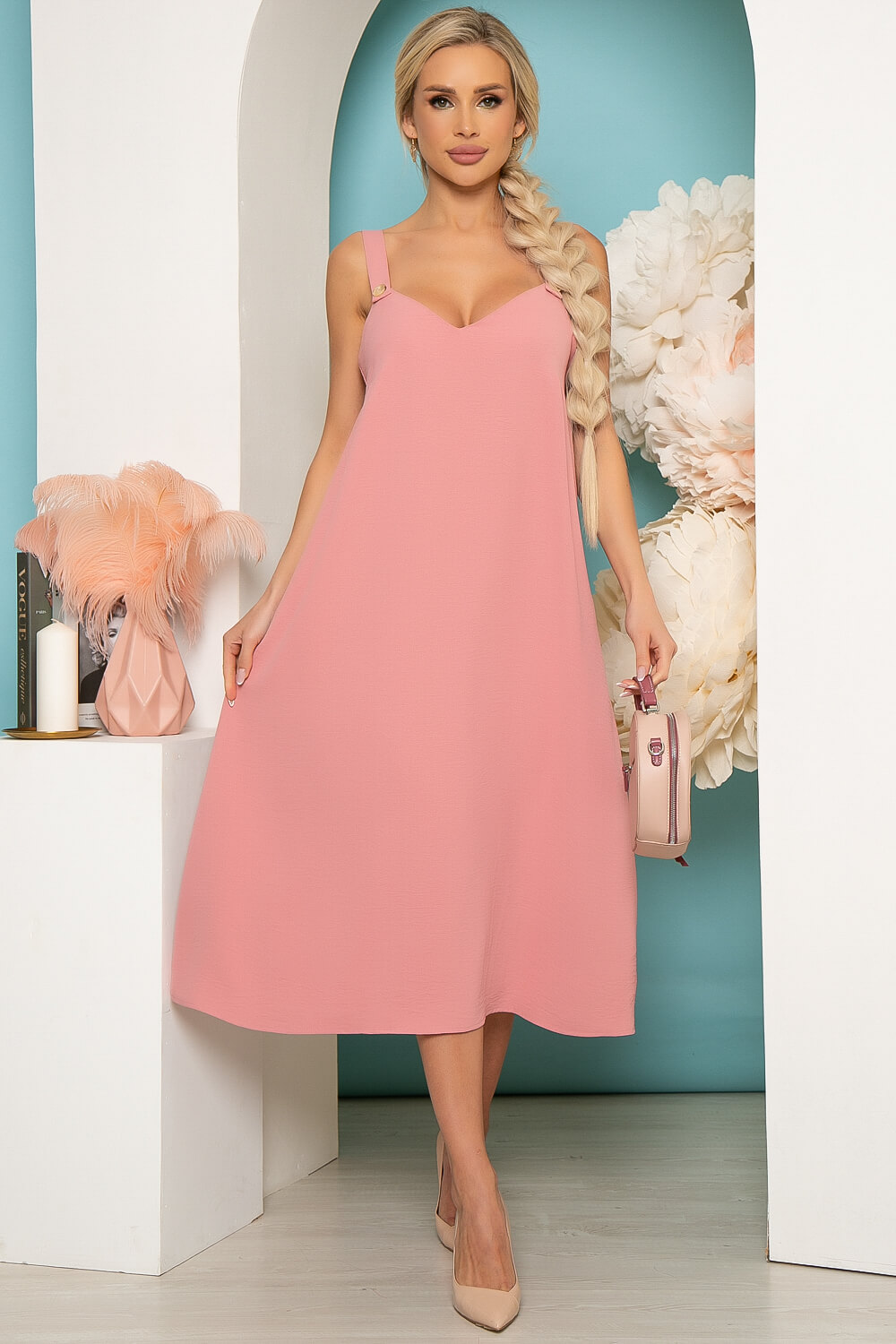 Сарафан из приятной к телу шелковистой ткани нежно-розового цвета в очень интересном исполнении. Красивый V-образный вырез горловины подчёркивает красоту зоны декольте. Акцентные лямочки украшают декоративные пуговицы. Сарафан А-силуэта, без замков, без подкладки.