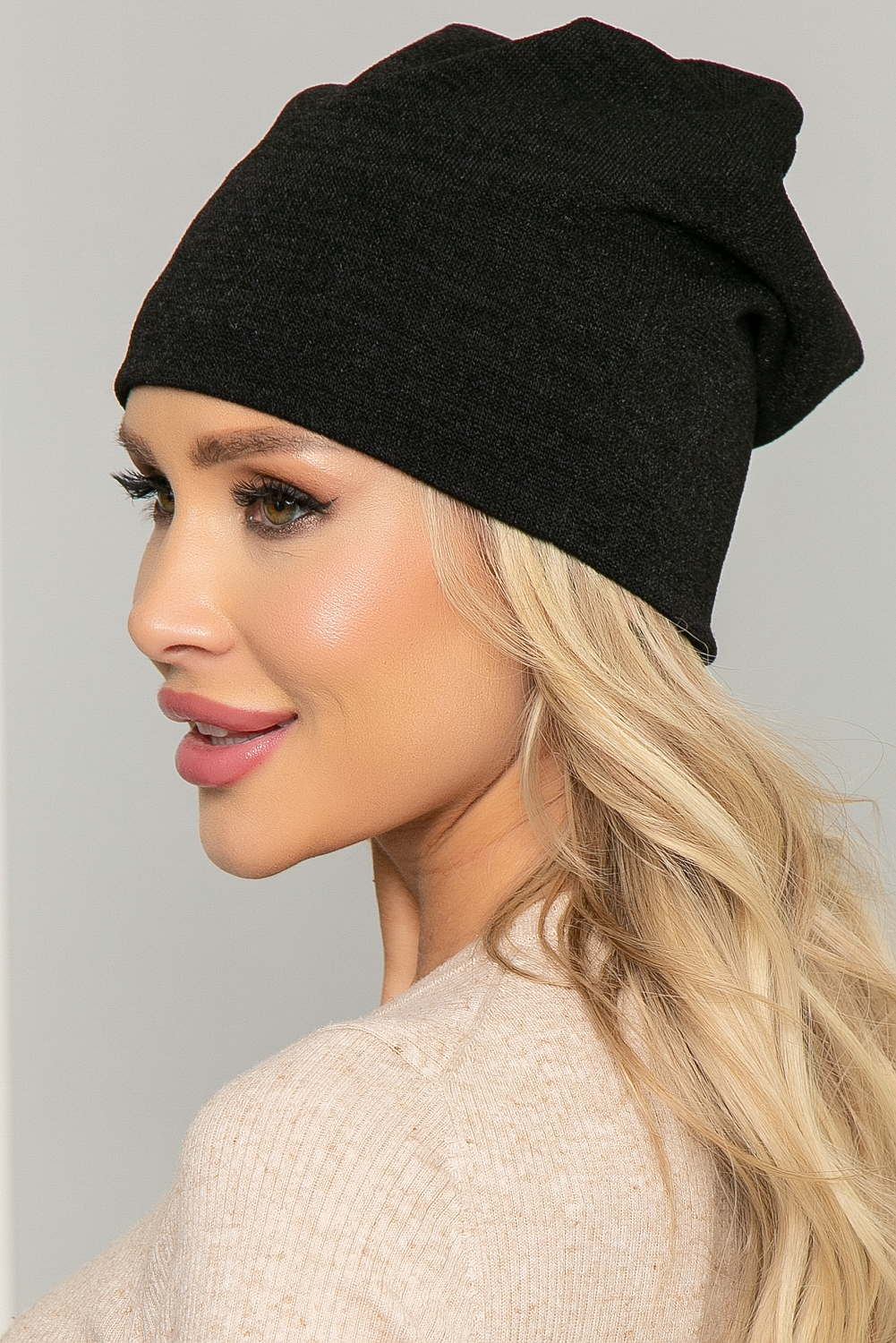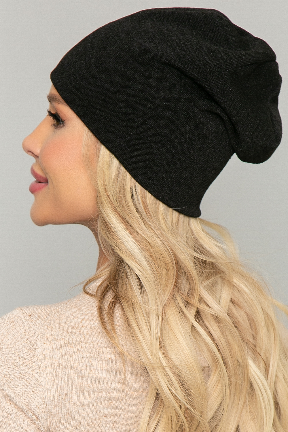 Стильная шапка из трикотажа классического чёрного цвета. Шапка имеет универсальную форму, состоит из 6-ти клиньев и подходит для любой формы лица. Можно носить с отгибкой и без.
