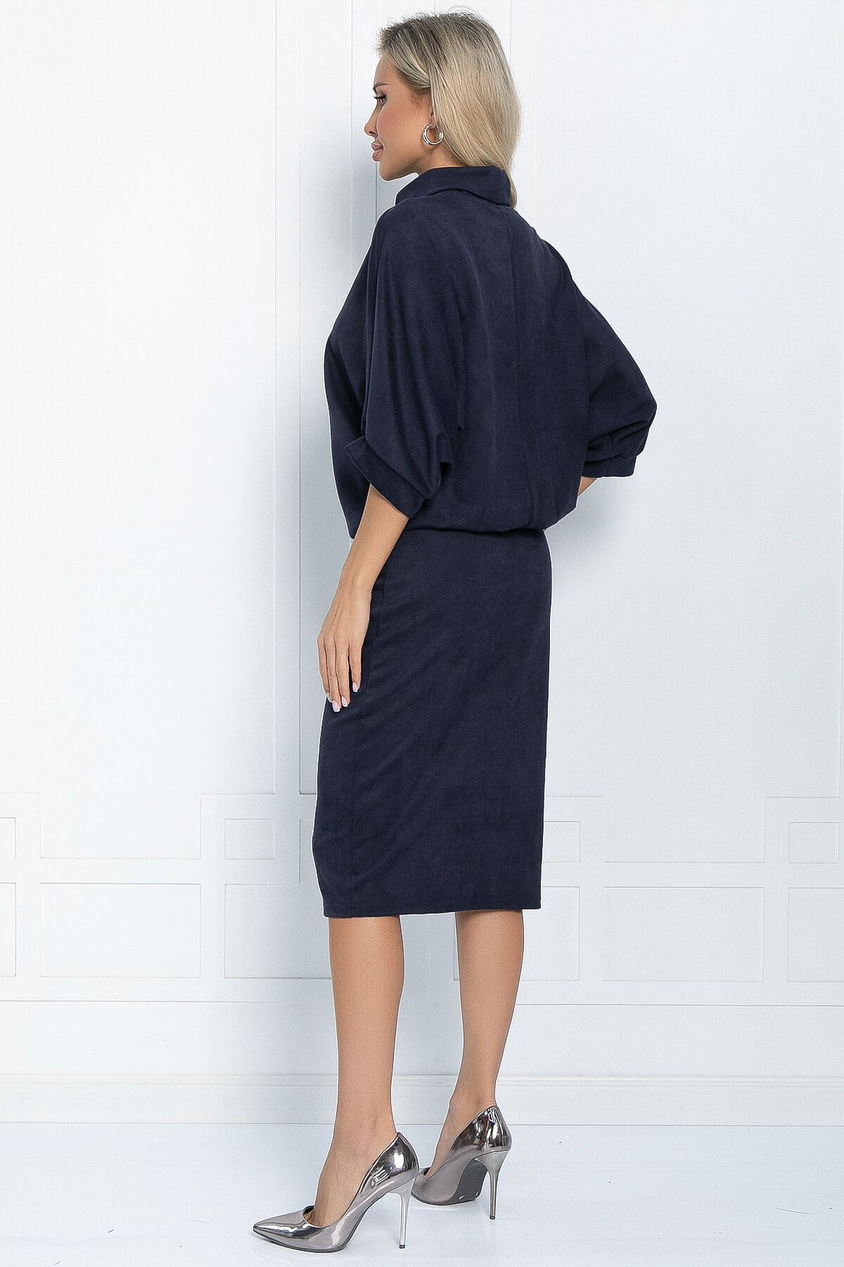 Платье из трикотажа темно-синего цвета. Элегантная юбка, прилегающего силуэта, подчеркнёт красоту женской фигуры и визуально вытянет силуэт, а верх скроенный по типу «летучая мышь» не будет сковывать движений. Платье прекрасно подойдёт в качестве повседневного варианта и будет хорошо сочетаться как с туфлями или ботильонами, так и с кроссовками или ботинками. Благодаря своему фасону платье прекрасно справляется с задачей скрыть небольшие недостатки фигуры и подчеркнуть достоинства. Пояс из основной ткани и подвеска входят в комплект.