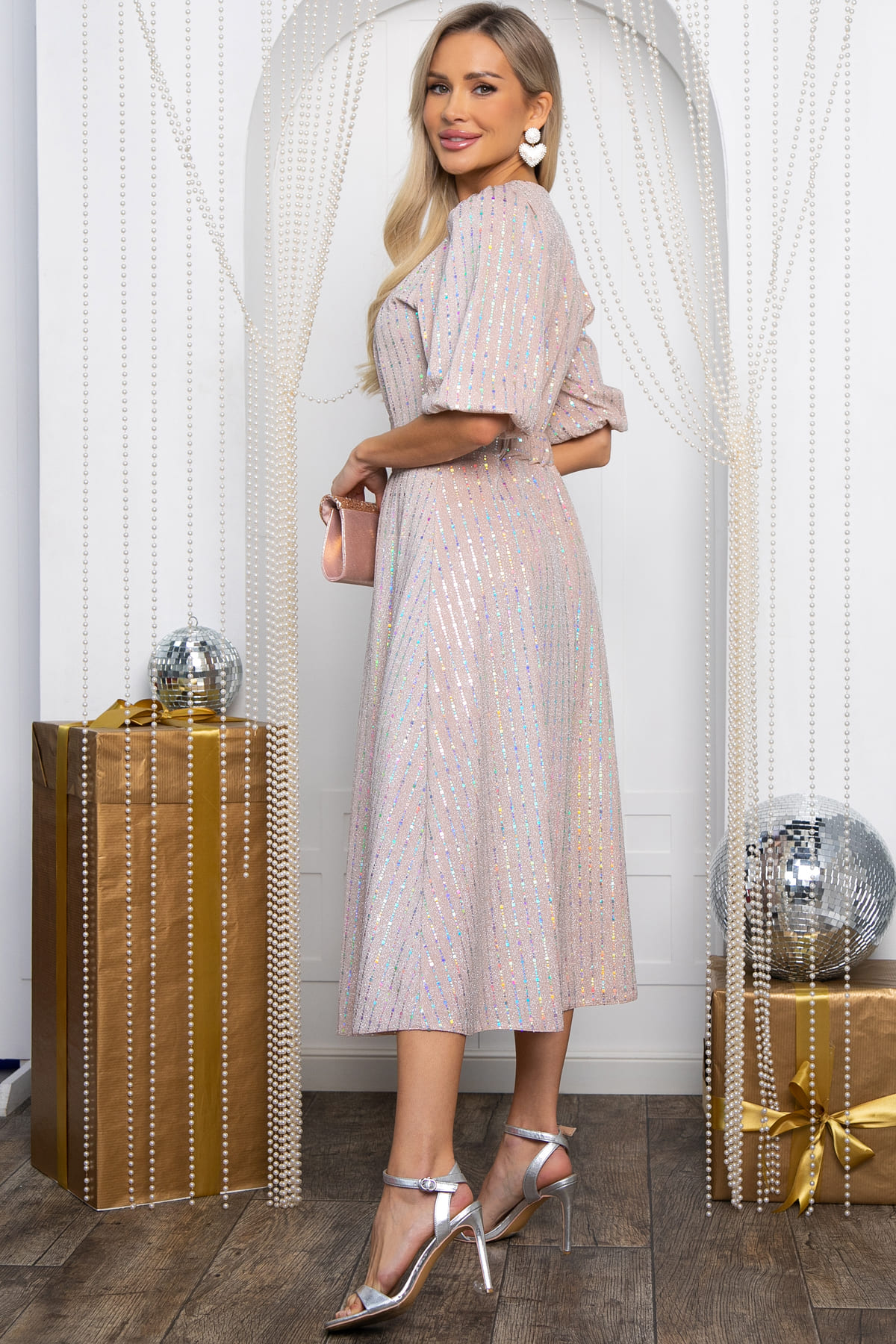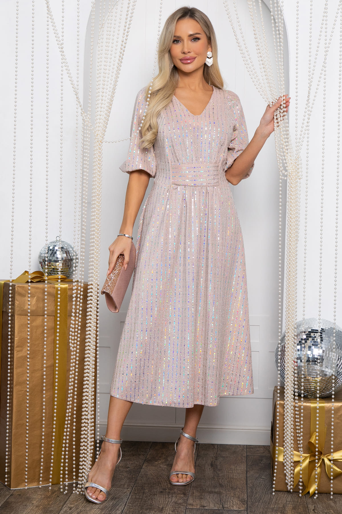 Праздничное приталенное платье длины миди в невероятном красивом персиковом цвете — элегантное решение для вашего вечернего образа! Благодаря отрезной талии оно гармонично подчеркивает фигуру, а расклешенная юбка придаёт образу легкость и женственность. Рукав реглан средней длины с мягкой сборкой сверху и собранный на резинку внизу создают стильный и комфортный силуэт. V-образная горловина придает изящный акцент, добавляющий нотки утонченности. Спереди платье украшено декоративной сборкой, аккуратно закрытой широким втачным поясом, а сзади пояс чуть поуже и собран на широкую резинку. Этот наряд позволит вам сиять на любом торжестве и подчеркнуть свою уникальность и женственность!