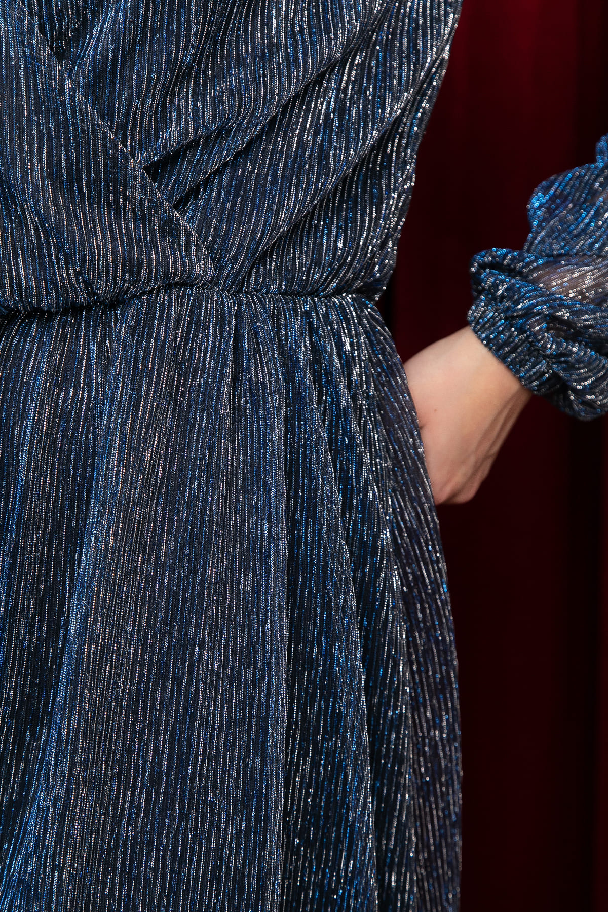 Летящее женственное платье в сине-серебряном цвете украсит Ваш образ на прогулке или неформальной встрече. Такая модель платья хороша тем, что актуальна круглый год, а также выглядит женственно, элегантно и празднично. Платье свободного кроя, рукав втачной, длинный. Талия на резинке.