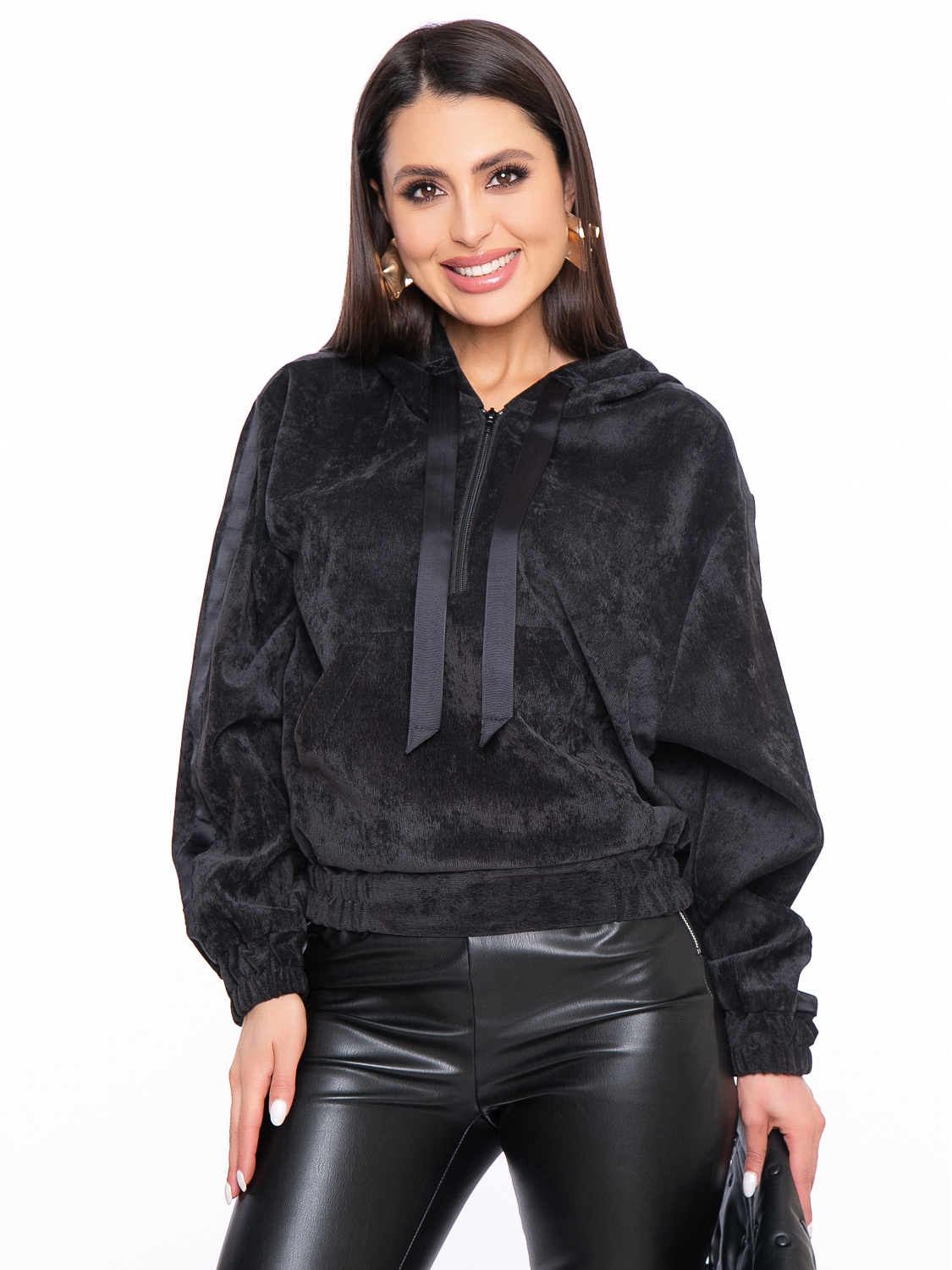 - Худи из вельвета свободного кроя с капюшоном и карманом кенгуру, по переду застежка-молния;
